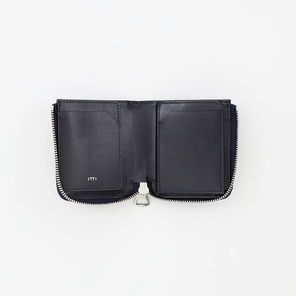 L字ファスナー仕様の二つ折りデザインで、手軽に収納できるコンパクトなボディが特徴。持ち運びに便利なサイズ感で、大きすぎず小さすぎず、片手にしっかりと収まります。