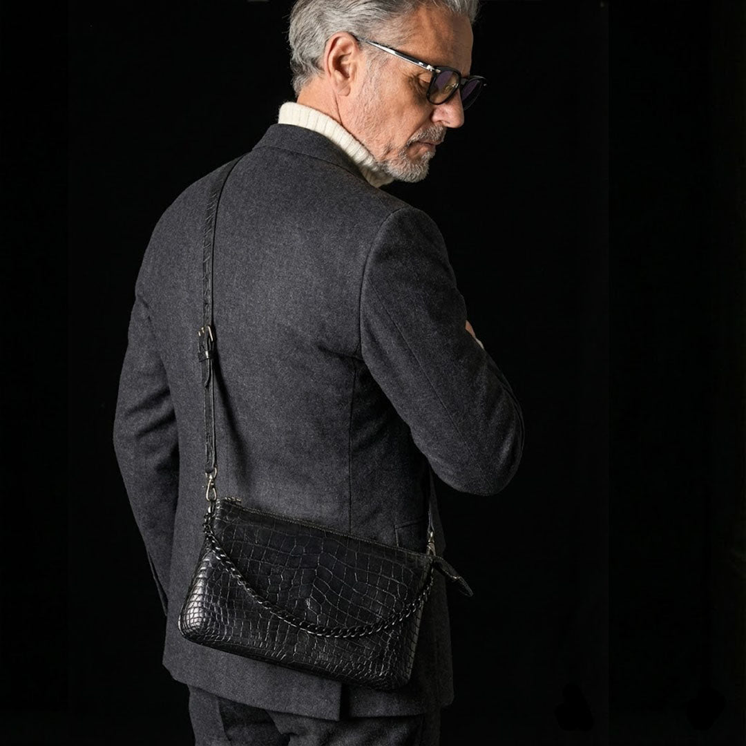 クロコダイルの柔らかな鱗に対し、マットブラックのチェーンハンドルが鋭い対比を生む。