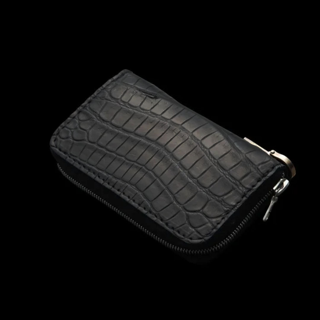 エキゾチックレザーの最高峰クロコダイルの皮革を使用。野性味の強い迫力のある表情は、鰐革でしか味わえない存在感を放っています。多種多様な鰐革の中でも均整が取れた表情の良いもののみを選別、丁寧に鞣しの工程を重ね耐久性のある仕上がりになっています。インサイドには頑丈で高級感のあるイタリアンオイルバケッタレザーを使用。グレーカラーは墨による染色を施しています。ミニラウンドファスナータイプのコインケース。コインケースの名称ですが内側に収納箇所を配備し、少量の札やカードの収納を可能にしています。小ぶりなスマートに纏め上げたサイズ感とは裏腹に、高い機能性を実現したデザイン。