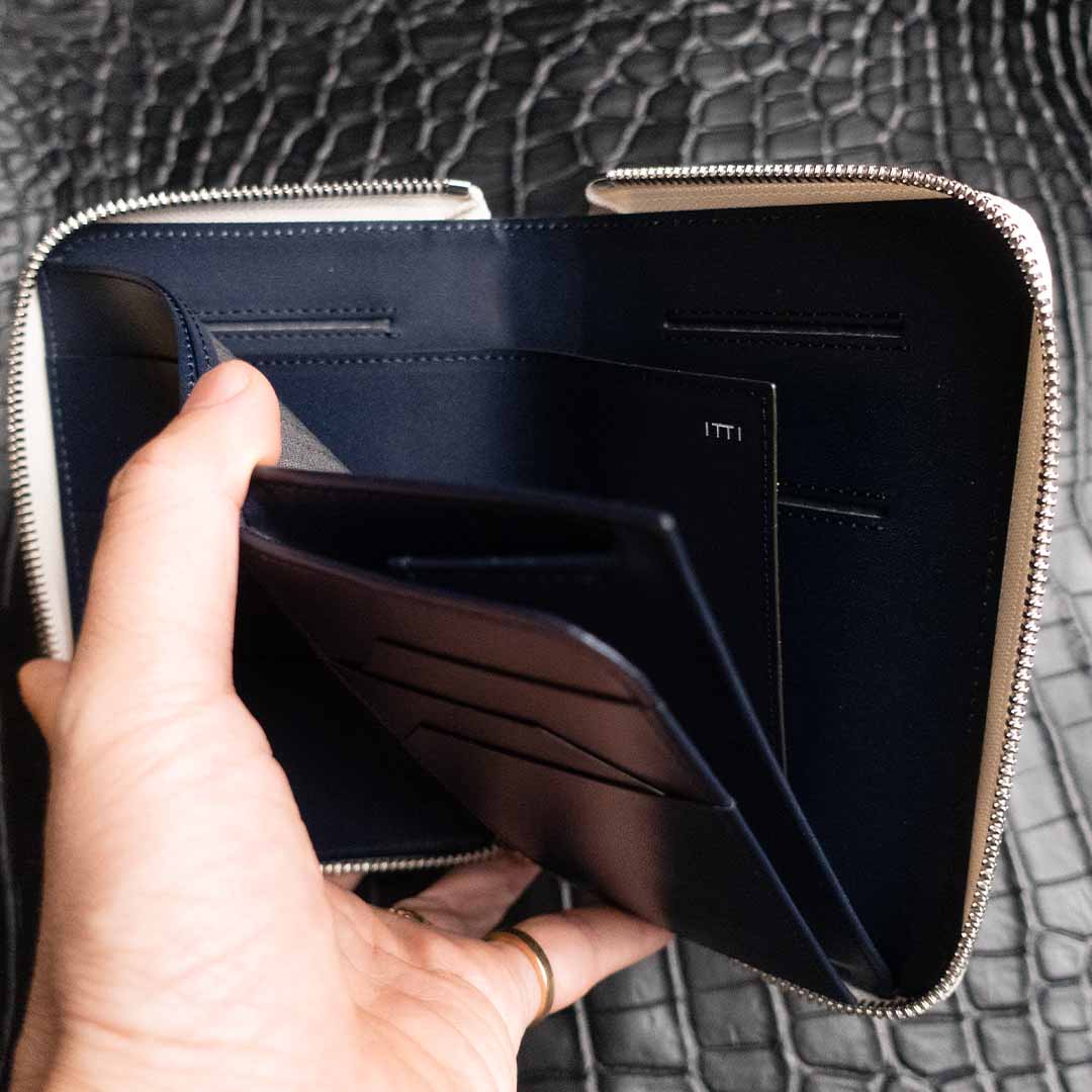 コンパクト財布ながらパスポートや通帳も入る独自の機能あふれる内装と